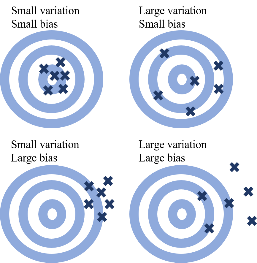 An analogy: random error is like scatter when you aim at the center of a target; bias is when the aim itself is off-center. The bias that arises when Kaplan–Meier curves are misused under competing risks is not random error. Random error can be reduced by increasing sample size, but bias cannot be fixed without improving study design and data collection.