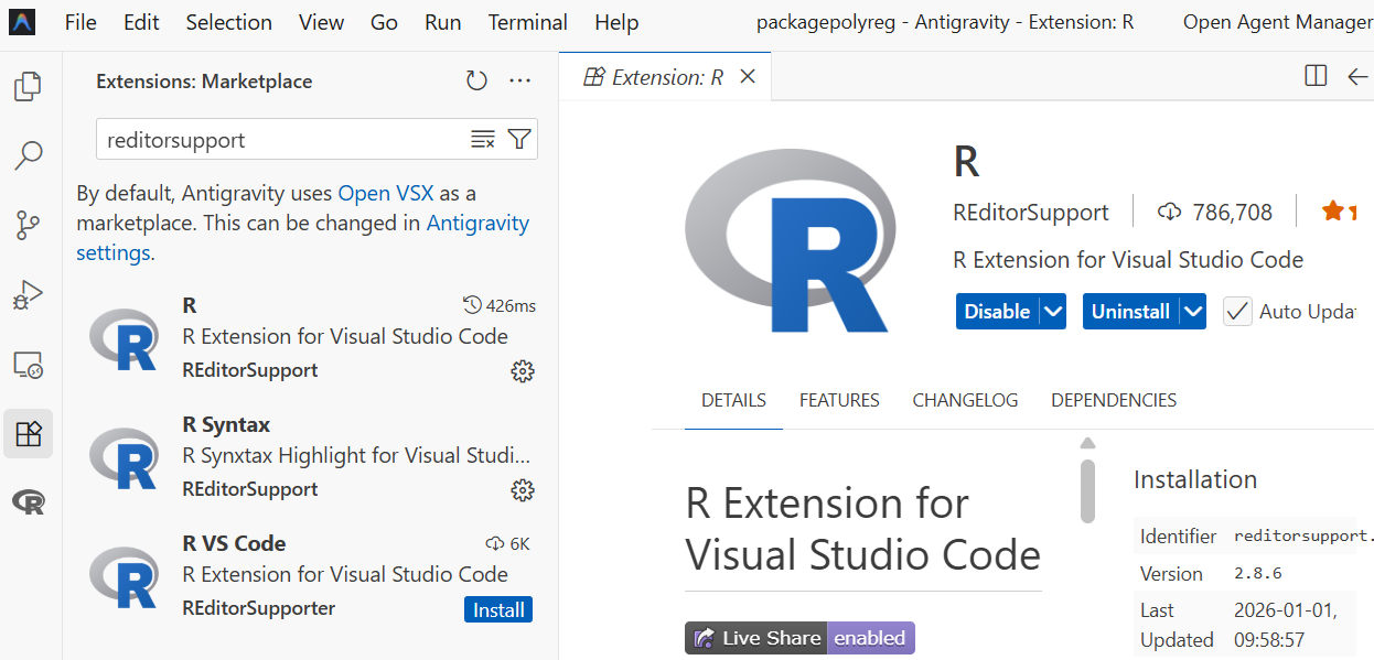 私「だいじょうぶ。えっとAntigravityを開く。R拡張機能はデフォルトで入ってないから追加する。左サイドバーでRを検索する。あれ、いっぱいヒットした、そりゃそうか。PublisherがREditorSupportのやつをインストールする」