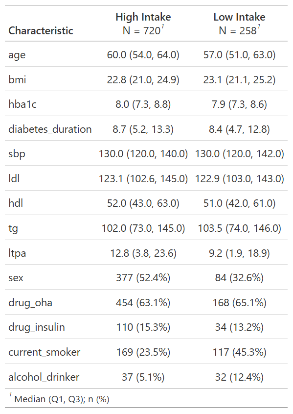 table2 <- CreateTableOne(vars = c(continuous_var, binary_var), strata = "fruitq1", data = dat_check, test = TRUE)