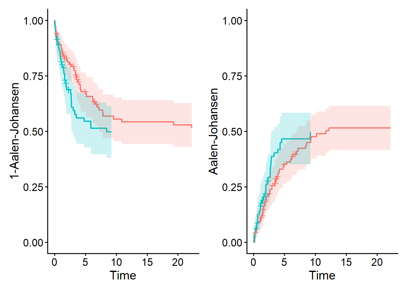 以下のRスクリプトでは、最初のcifplot()により、再発(code.event1=1)に関するAalen-Johansen曲線(aj_event1)を出力しています。縦軸は累積発生確率ではなく、1-累積発生確率を選んでいる点にも注意してください(type.y="surv")。そして次のcifplot()ではイベントを入れ替えて、再発を経験しない死亡(code.event1=2)に関するAalen-Johansen曲線(aj_event2)を出力し、cifpanel()に用いて2つの図を左右に配置したひとつの図を表示しています。左右の累積発生確率の和に注目してください。この図からは、再発の累積発生確率と(再発を経験しない)死亡の累積発生確率の和は、時間が経つにつれ1に近づくが、1を超えることはないことがわかります。仮に打ち切りがなかったとしたら、再発と(再発を経験しない)死亡のどちらか一方しか生じないため、Aalen-Johansen曲線の和が1を超えないのは自然なことです。