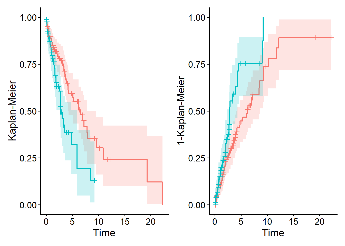 新しく作ったイベント変数status_cir1とstatus_cir2を用いると、再発のKaplan-Meier曲線と(再発を経験しない)死亡のKaplan-Meier曲線を描くことができます。これらのKaplan-Meier曲線を左右に配置した図を、先ほどのAalen-Johansen曲線の図と比べてみてください。先ほどのAalen-Johansen曲線の和とは違い、Kaplan-Meier曲線の和が1を超えてしまって計算が合わないことが読み取れたでしょうか。