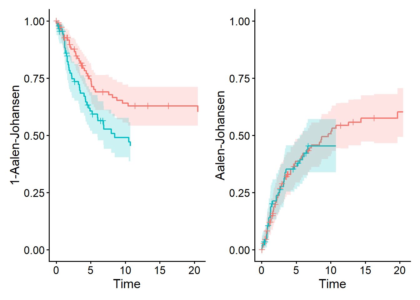 以下のRスクリプトでは、最初のcifplot()により、再発(code.event1=1)に関するAalen-Johansen曲線(aj_event1)を出力しています。縦軸は累積発生確率ではなく、1-累積発生確率を選んでいる点にも注意してください(type.y="surv")。そして次のcifplot()ではイベントを入れ替えて、再発を経験しない死亡(code.event1=1)に関するAalen-Johansen曲線(aj_event2)を出力し、cifpanel()に用いて2つの図を左右に配置したひとつの図を表示しています。左右の累積発生確率の和に注目してください。この図からは、再発の累積発生確率と(再発を経験しない)死亡の累積発生確率の和は、時間が経つにつれ1に近づくが、1を超えることはないことがわかります。仮に打ち切りがなかったとしたら、再発と(再発を経験しない)死亡のどちらか一方しか生じないため、Aalen-Johansen曲線の和が1を超えないのは自然なことです。