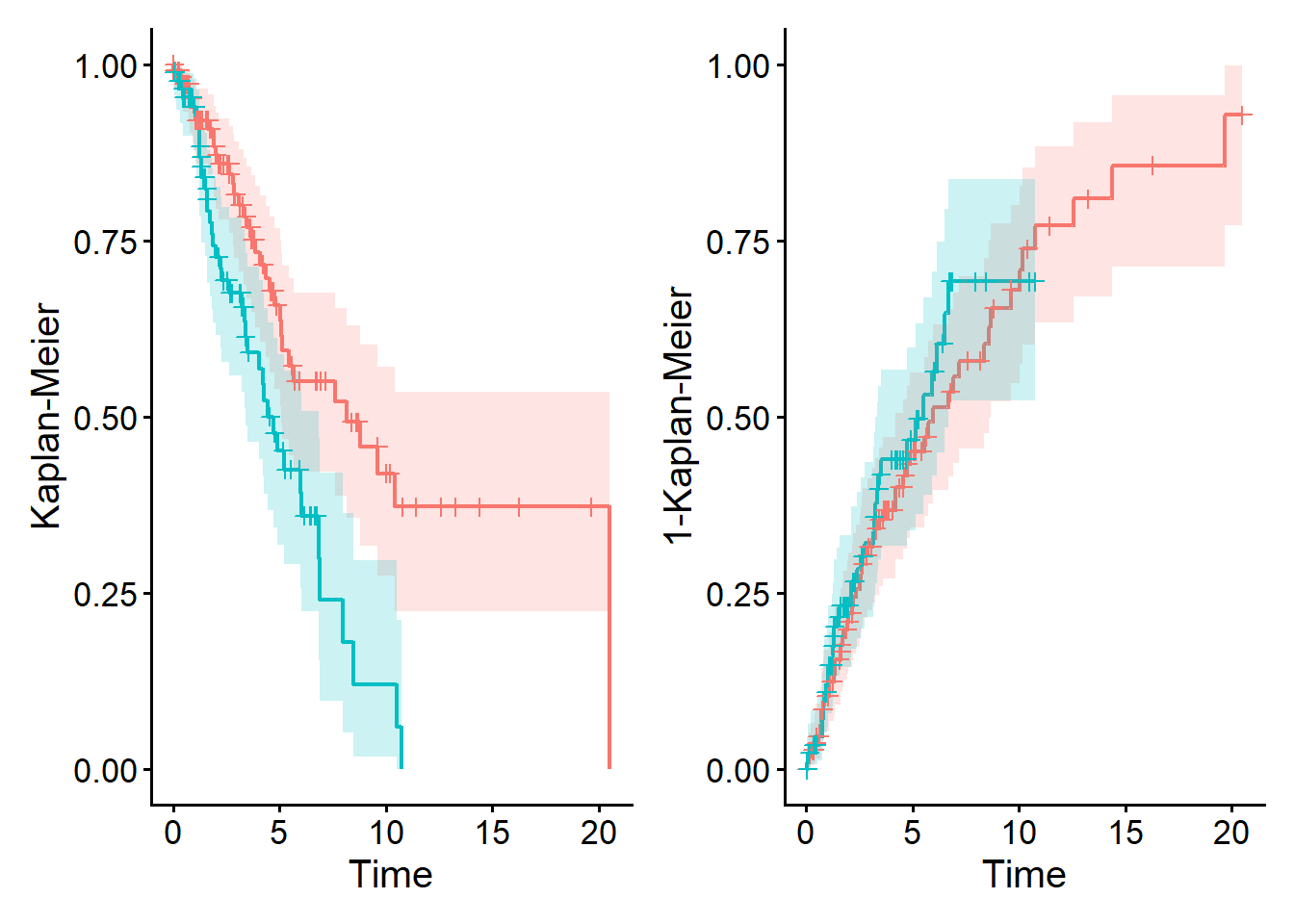 新しく作ったイベント変数status_cir1とstatus_cir2を用いると、再発のKaplan-Meier曲線と(再発を経験しない)死亡のKaplan-Meier曲線を描くことができます。これらのKaplan-Meier曲線を左右に配置した図を、先ほどのAalen-Johansen曲線の図と比べてみてください。先ほどのAalen-Johansen曲線の和とは違い、Kaplan-Meier曲線の和が1を超えてしまって計算が合わないことが読み取れたでしょうか。