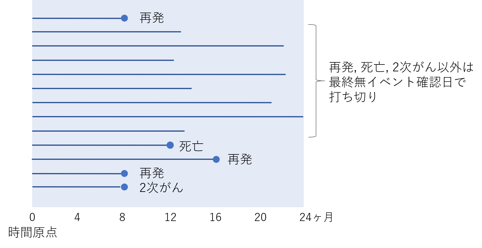 お父さん「RFSでは、イベントは死亡と再発のするのが普通。つまり二次がんはイベントに含めない。無再発期間だったらイベントは再発だけ。図をみたら、イメージしやすくなるかな」